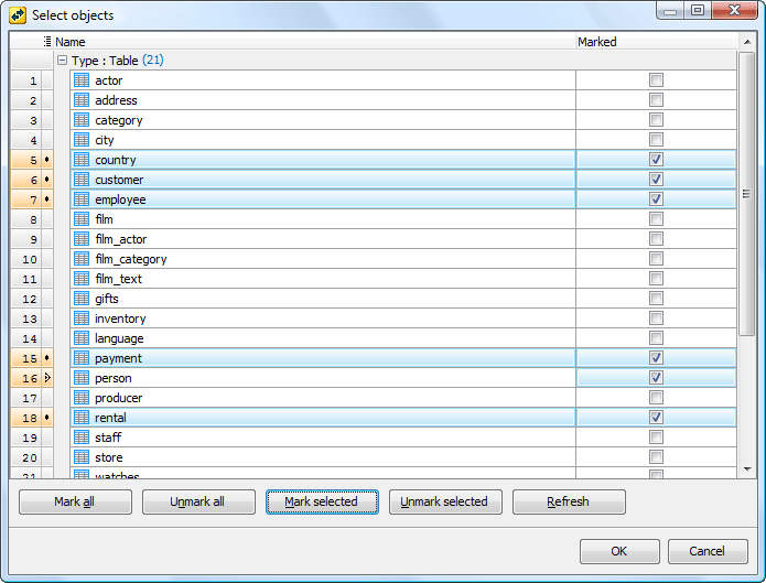 To specify tables where you want to import data, click the Add... button and pick the tables in the Select objects dialog. To choose several tables at a time, select them using Ctrl and Shift keys, then click Mark selected.