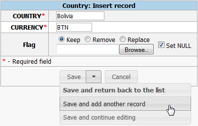 New insertion and editing modes. Starting with this version the Save button in the Insert Record form allows you to post changes to the database and re-open the form for adding another record in a single click (without returning to the List page). Another useful thing is a possibility of continue editing of the record after posting the changes in both Edit and Insert forms.