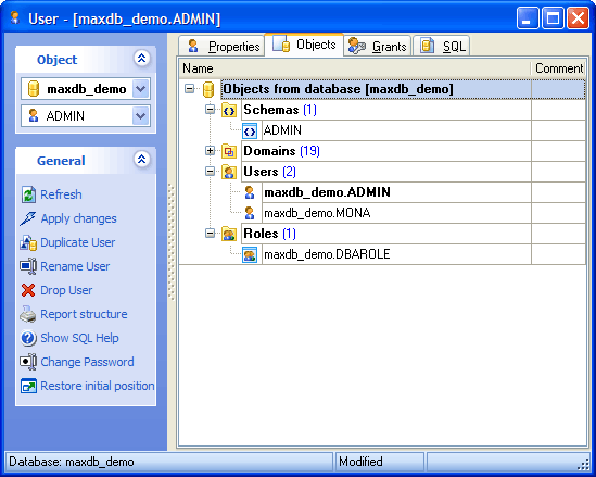 Objects that are having this user as the owner are managed within the Objects tab of User Editor. Use grid's popup menu or corresponding links of the navigation bar or shortcuts to manage these objects.