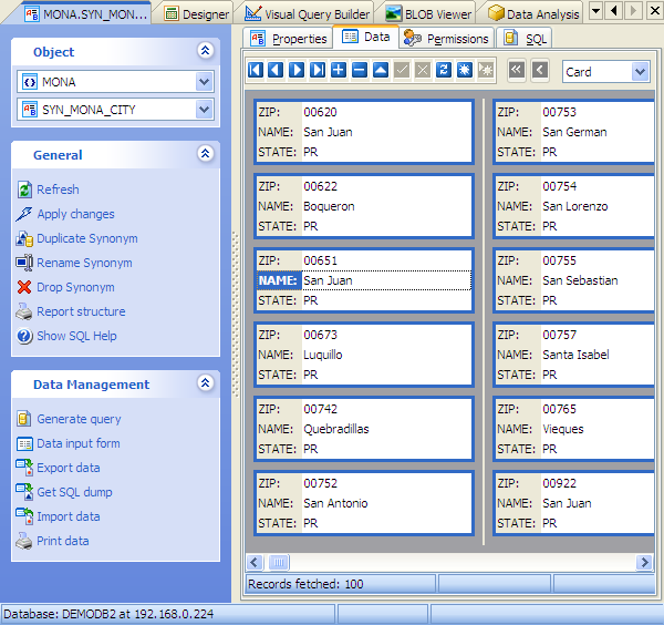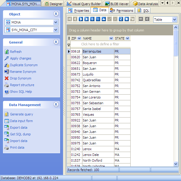 The Data tab displays the Alias data as a grid (see Data View for details). Use grid’s popup menu to open Data Input Form, to invoke the Export Data, and Get SQL Dump modules, to set the value of the selected record to NULL or to Now (for Date values).