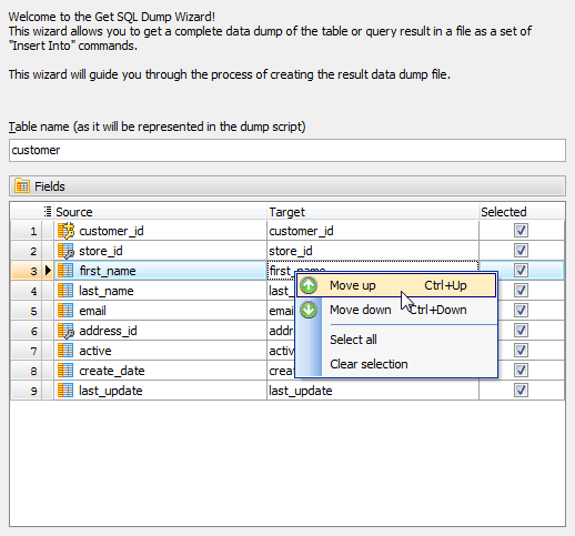You can also select the fields to be included in the result INSERT statement. All the table fields are included into the Selected fields list by default. If you do not want some fields to be exported, move them back to the Available fields list. Text, GUID, Date, Time, and DateTime columns are included in the result INSERT statements according to the Storage Options of the Database Profile.