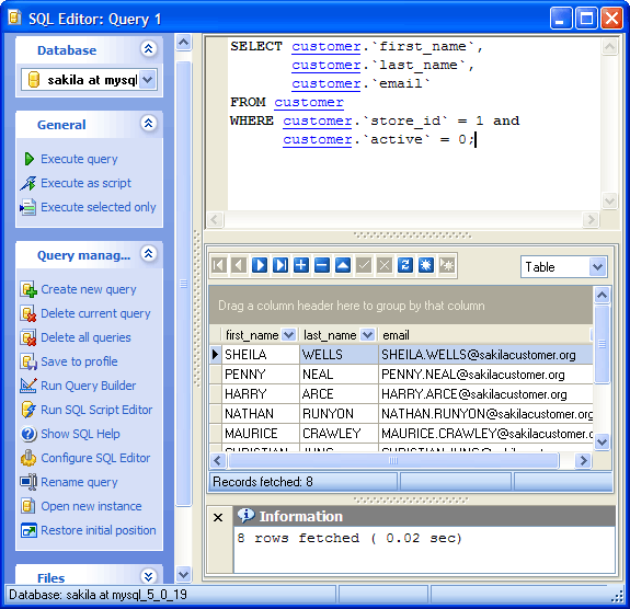 SQL Editor is the basic Code Factory for MySQL tool for creating and executing queries. It allows you to create and edit SQL text for the query, prepare and execute queries, and view the results of execution.