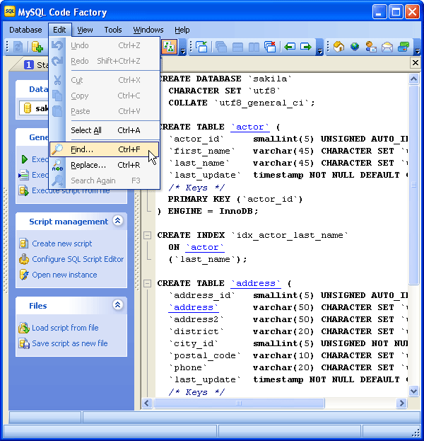 Code Factory for MySQL provides two dialogs for searching and replacing text in the editor areas of the database tools. Both of them are available through the popup menu of the editor area.