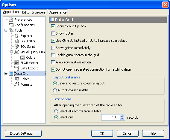 Select whether Code Factory for MySQL should remember the column positions for the grids or fit them automatically.