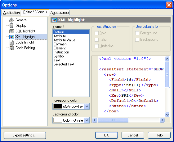Use the XML highlight item to customize syntax highlight for the XML tab of the Table Editor. Select the text element from the list, e.g. attribute or attribute value and adjust its foreground color, background color and text attributes according to your wishes.