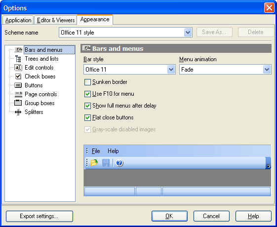 Use the Bars and menus item to customize Code Factory for MySQL toolbars style and menus animation.