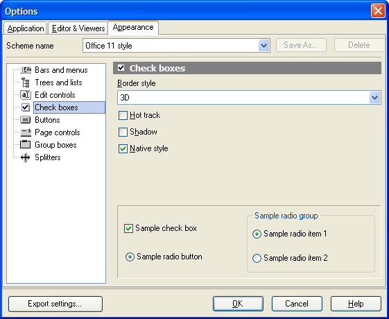 The Check boxes item allows you to customize the appearance of check boxes and radio buttons.