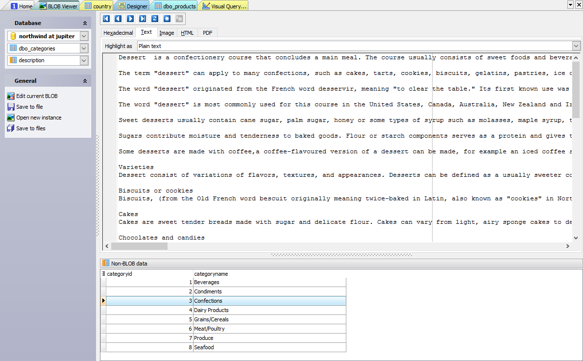 Using SQL Maestro for MySQL you can view or edit BLOB data in the following ways: hexadecimal dump, plain text, graphical image or HTML page. A graphical representation of BLOB data supports five image formats: BMP, Windows metafile, JPEG, GIF and PNG.