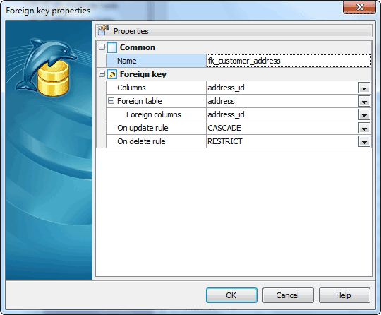 Set the Foreign Key Name, select Columns from the Available Fields list to include into the foreign key, select the Foreign Table Name from the drop-down list and its fields from the list to include, set other foreign key properties and apply the changes by clicking the OK button.