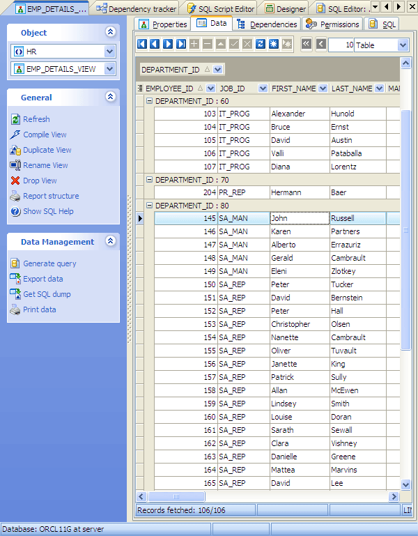 The Data tab displays the data represented in the view as a grid (see Data View for details). The popup menu of this tab and the Data Management navigation bar allow you to export data, get SQL dump, set the value of the selected record to Null or to Now (for Date values). In tables with BLOB fields you can also call BLOB Editor to view and edit the BLOB fields.