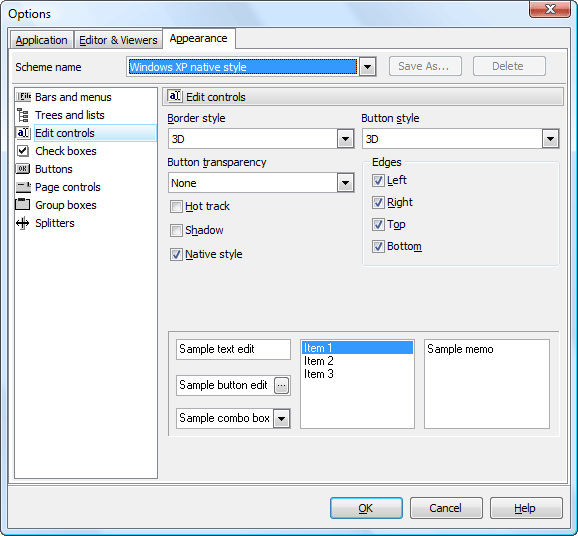 Use the Edit controls item to customize the appearance of different Oracle Maestro edit controls. The tab allows you to select the edit controls border style, button style and transparency, enable/disable hot tracks, shadows, native style and customize edges. It is also possible to define samples for the text edit, button edit and combo box controls.