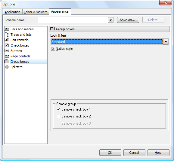 Use the Group boxes item to customize all Oracle Maestro group boxes according to your preferences. Use tab to apply styles for group boxes, enable/disable native style and define samples.