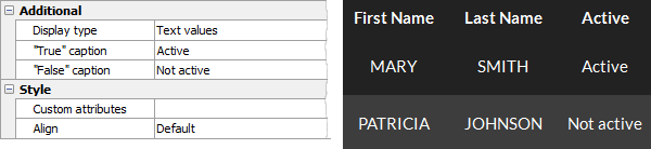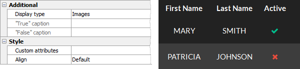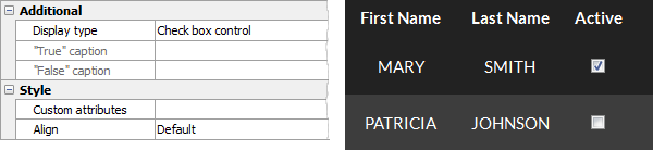 Use this control to display column values as checkboxes. This type of representation is used for columns storing BOOLEAN, or INTEGER data. ASA PHP Generator provides you with the following types of the control appearance.