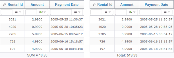 This picture demonstrates the difference between a webpage generated with default footer and a webpage with the OnCuStomRenderTotals event specified in this way: