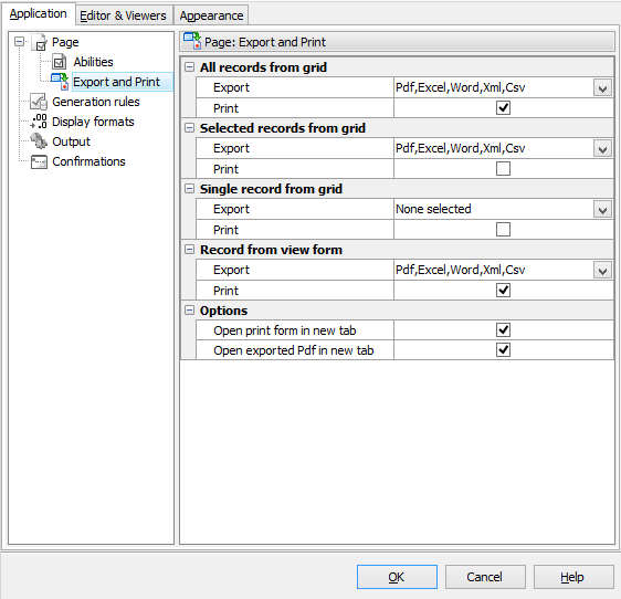 This tab allows you to specify default exporting and printing options to be available for all the generated pages in all applications. These settings can be overwritten for a project as well as for a certain page.
