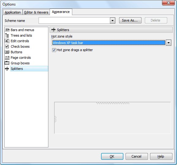 Use the Splitters item to customize all ASA PHP Generator splitters according to your preferences. Use the tab to select hot zone style (Windows XP task bar, Media Player 8, Media Player 9, Simple or none) and specify the Hot zone drags a splitter option.